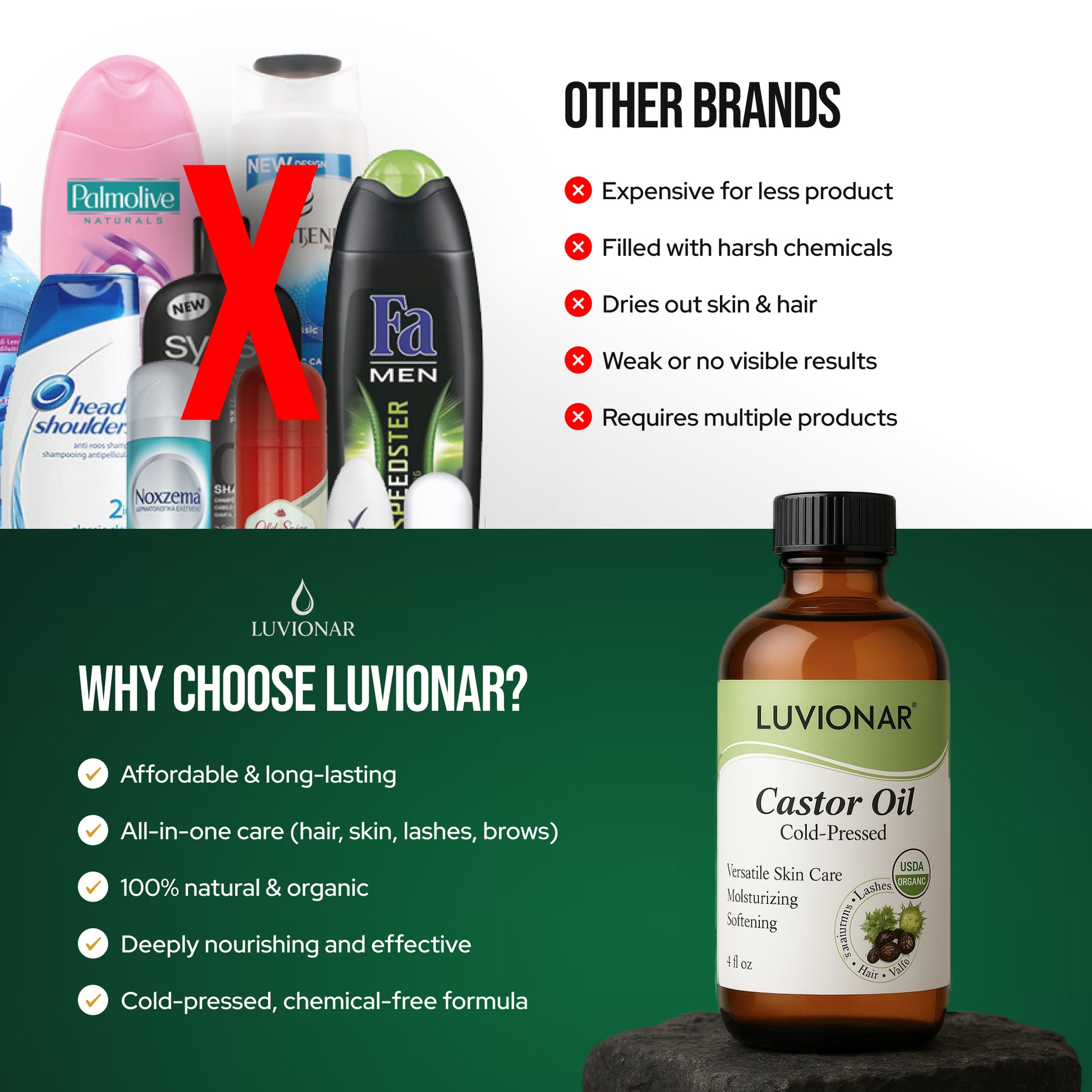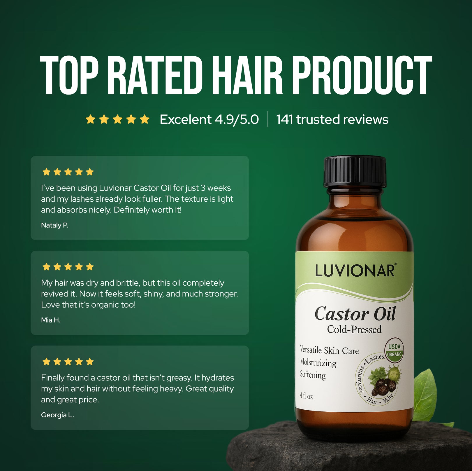 Luvionar Castor Oil promotes thicker, fuller hair and supports longer lashes and brows. It deeply moisturizes and nourishes, repairing damage and combating dryness for softer, healthier-looking results.